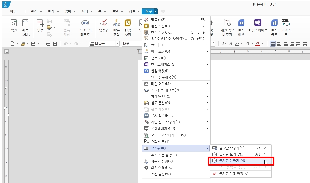 이제 새로 만든 글자판으로 바꿀 차례입니다.메뉴- 도구-글자판 바꾸기를 클릭합니다. 아래 새창이 열립니다.