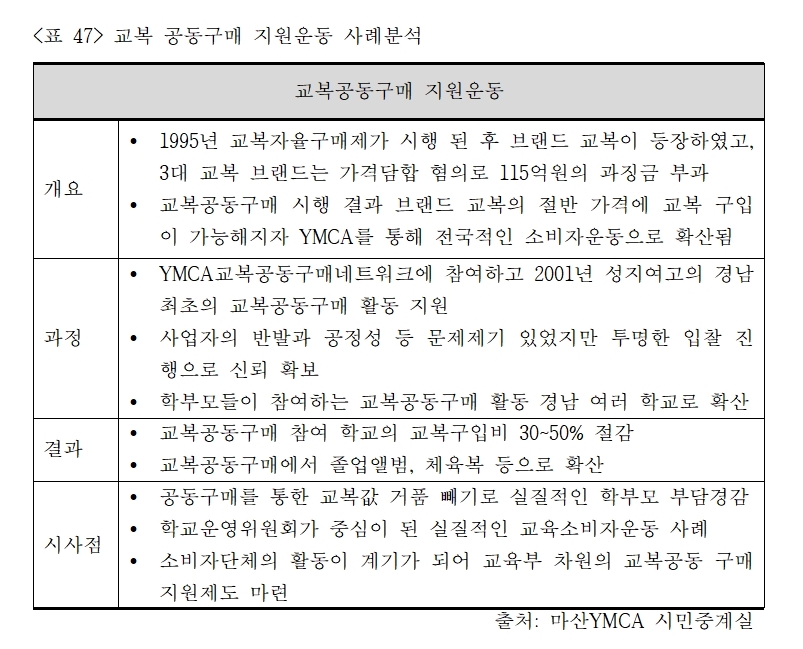 또한 마산YMCA 시민중계실은 거제 지역 교복공동구매 설명회에 참가하여 ‘마산지역 교복공동구매 사례 발표’를 하고, 거제 지역에 교복공동구매를 확산시켰다. 마산YMCA 시민중계실은 거제교육네트워크를 통해 거제중학교와 신현중학교에서 교복공동구매운동을 지원하여, 기존 15만원 선이었던 교복가격을 동복 7만 3,000원, 하복 3만 1,000원으로 낮추는 성과를 거두게 되었다. 마산YMCA를 비롯한 소비자단체들과 학부모 조직을 통해 교복공동구매가 지속적으로 확산되고 정착되는 과정에 교육부는 학생교복 일괄구매 매뉴얼(2010), 교복가격 안정화를 위한 교복 공동구매 운영 요령 안내(2013) 등의 자료를 만들어 시도교육청을 통해 일선 학교까지 배포하는 등 정부 차원의 공동구매 지원이 이루어지게 되었다. 마산YMCA 교복공동구매 지원 운동은 2001년 이후 더 이상 지속되지 않았다(<표 47>).