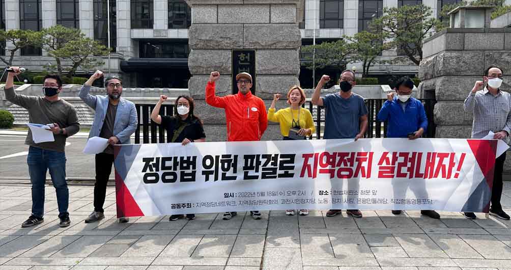 결국 우리나라 정당법은 “정치에 뜻이 있는 사람들이 모여도 지방사람들끼리 모여 지방에서는 정당을 설립할 수 없고 서울로 가거나 혹은 서울에 있는 사람들하고 뜻이 맞아야만 정당을 설립할 수 있는 것입니다.” 1991년 지방자치가 시작되고 나서 이런 정당법이 헌법의 취지에 어긋난다며 위헌 소송을 냈지만 2004년에 헌법재판소는 문제가 없다고 판결하였습니다. 최근에는 서울영등포에 거주하는 A씨가 18년만에 다시 한번 위헌 소송을 내고 새로운 판결을 기대하고 있습니다.