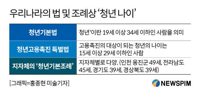 심지어 2020년 8월 시행된 청년기본법에는 청년을 19이상 34세 이하로 정해놓고 있는데, 지방정부들이 청년 연령의 상한선을 39세에서 54세까지 높이고 있다는 것입니다. 물론 지방정부들이 왜 청년 나이를 높이는지 이해가는 측면도 다분히 있습니다.