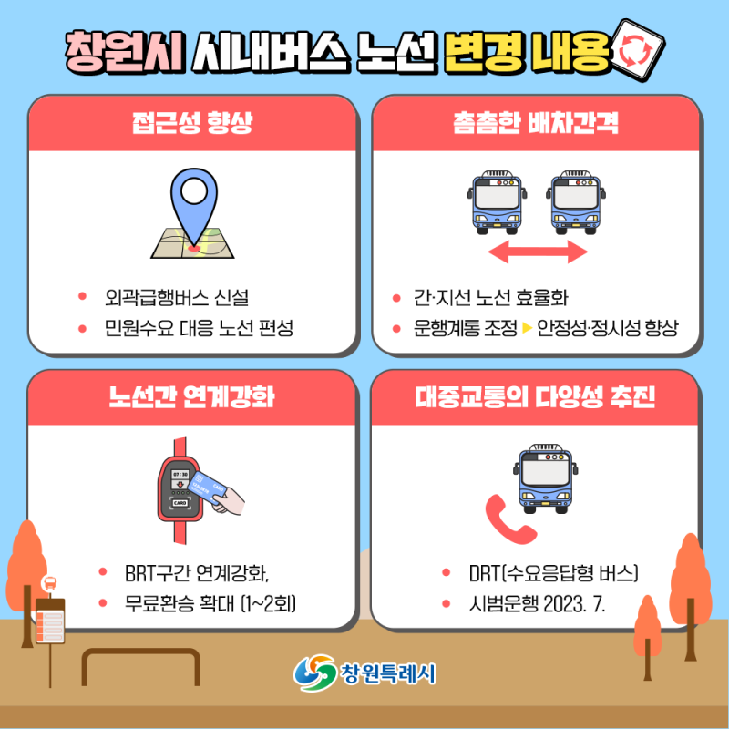 창원시는 버스 노선이 없다며 시민들의 불만이 많았던 창원중앙역에서 중앙대로 창원병원을 순환하는 수요응답형 버스를 시범 운행 한 후에 용역을 거쳐 보급을 내년에는 농어촌 지역으로 확대할 계획입니다. 이 버스는 자체 앱을 설치하여 호출하여 탑승할 수 있으며 시내버스와 같은 요금을 내면 됩니다.