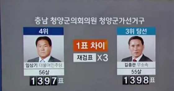 2008년 6월 강원 고성군수 보궐선거에서도 1표 차이로 당락이 엇갈린 사례가 있었습니다. 1차 개표에서 두 후보가 똑같은 표를 얻었으나 재검표 결과 1표 차이로 당락이 결정되었습니다. 국회의원 선거의 경우에도 16대 총선 때 경기도 광주에서 후보가 3표 차이로 당락이 결정되는 사례가 있었습니다.