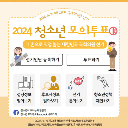 경남지역 7개 YMCA를 주축으로 한 청소년 단체들은 <청소년이 직접 뽑는 청소년 모의투표운동 경남본부>를 결성하고, 지난 2월 29일 경남도청 프레스센터에서 기자회견을 개최하고 약 한 달 반 동안 9세 ~ 17세 사이 비유권 청소년 유권자를 모아서 지난 4월 10일 오프라인 투표를 진행하고, 온라인으로는 전국적인 정당 투표를 17개 시도에서 동시에 진행하였습니다.