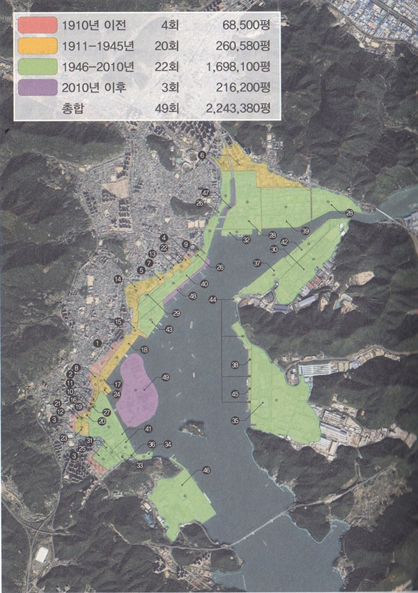 저자는 도시사의 관점에서 지난 120여 년간 마산 역사는 곧 바다(해안) 매립의 역사라고 보고 있는데, 1904년 일본 육군이 당시 마산역 부지 조성을 위해 시작한 첫 번째 매립부터 2011년 마산시가 시작한 해양신도시 매립까지 마흔아홉 번의 매립과정을 상세히 기록하고 있다. 마산만에서는 해방 전에 총 24회의 매립이 이루어졌고, 해방 이후 25번의 매립이 이루어졌다고 한다.