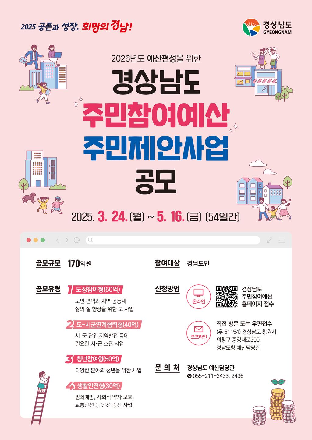앞서 말씀 드렸듯이 경상남도는 5월 16일까지 각 시군은 5월 9일까지 내년도 주민제안 공모사업을 추진하고 있는데요. 경상남도는 주민참여예산 공모사업에 170억 원의 예산을 배정해두고 있습니다. 정부 세수가 감소하면서 지방자치단체의 모든 부서가 사업 예산을 일괄 삭감하는 등 긴축 예산이 지속되고 있지만, 주민참여예산 공모사업에는 170억원이라는 적지 않은 예산을 배정해놓고 주민들의 제안을 접수하고 있는 중이고 창원시 30억원을 비롯하여 시군에도 모두 예산이 배정되어 있습니다.