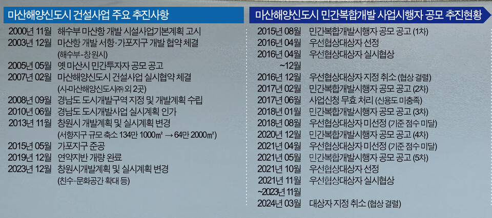 한편, 21대 대통령선거를 앞두고 마산YMCA와 창원물생명시민연대를 비롯한 시민단체들은 토론회와 기자회견을 통해 마산만에 조성된 인공섬에 더이상 아파트와 상가를 짓지 말자는 주장을 하고 나섰습니다. 왜냐하면 민간사업자를 통한 개발은 성공해도 문제고, 실패하면 더 큰 문제가 될 것이라는 진단이 나왔기 때문입니다.