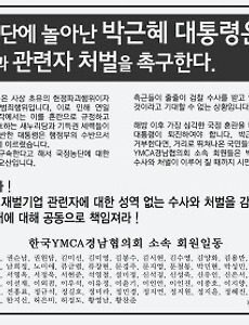 728x90 반응형 박근혜 퇴진3 박근혜 사퇴 촉구...한국YMCA 비상시국선언문 전국 68개 지역YMCA는 11월 2일과 11월 9일 두 차례에 걸쳐 전국 사무총장 간사회의, 전국 이사장, 사무총장 연석회의를 개최하였습니다. 두 차례의 비상시국회의를 통해 11월 12일 광화문 광장에서 개최하는 민중총궐기 대회를 비롯한 촛불문화제에 전국 회원들과 함께 적극적으로 참여하기로 결의하였습니다. 아울러 12일 오후 2시부터 전국YMCA 시국기도회를 개최하고 광화문 촛불 집회에 참여하였으며, 박근혜 대통령 사퇴를 촉구하는 시국선언문을 채택하였습니다. 전국 68개 YMCA는 각 지역별로 진행되고 있는 지역 단위 박근혜 퇴진운동에도 적극 결합하고, 매주 시국기도회를 개최하는 등 회원들과 함께 사퇴운동을 진행해나가기로 하였습니다. 한국YMCA 전국연맹은 박근혜 퇴진, 조기 대선 실시, 과도국민내각 .. 2016. 11. 16. 박근혜 퇴진 촉구 시국 선언 ~ 한국YMCA경남협의회 대표자들은 지난 11월 5일 창원대학교 사회관에서 개최된 2016년 경남YMCA유지지도자협의회에서 '박근혜 대통령 사퇴를 촉구하는 시국선언문'을 채택하였습니다. 아울러 경남에 지역에서 활동하는 거창YMCA, 거제YMCA, 김해YMCA, 마산YMCA, 양산YMCA, 진주YMCA, 통영YMCA, 창원YMCA 등 8개 회원들이 참여하는 사퇴촉구 시국선언 광고를 게재하기로 결의하였습니다. 박근혜 퇴진에 공감하는 회원들이 십시일반으로 광고비를 모아 일간신문에 광고를 내기로 결의한 것입니다. 지난 11월 10일 1차 광고를 게재하였고, 16일에는 2차 시국선언 광고가 나갈 예정입니다. 비선실세의 국정농단에 놀아난 박근혜 대통령은 즉각 사퇴하고, 철저한 진상규명과 관련자 처벌을 촉구한다. 박근혜.. 2016. 11. 10. 이남종 열사 죽음은 정치적 항거 12월 31일 오후 서울역앞 고가도로에서 고 이남종 열사가 '박근혜 사퇴, 특검 실시"라고 쓴 현수막을 내걸고 몸을 불살랐습니다. 하지만 사람들의 시선은 연말 연예대상 시상식에 쏠려있었고, 마치 준비하고 있었던 것처럼 유명 연예인의 열애설이 터져나왔습니다. 병원으로 옮겨진 그가 끝내 숨을 거두었을 때에도 수많은 사람들의 해맞이에 여념이 없었고, 새해 둘째 날 출근한 사무실에서도 유명연예인의 열애 이야기만이 화제가 되고 있었습니다. 참으로 안타까운 일이 아닐 수 없었습니다. 이남종 열사의 죽음을 폄훼하고 국민들의 눈과 귀를 막은 것은 경찰과 언론이었습니다. 경찰은 그의 죽음을 "경제적 어려움, 어머니의 병환"등으로 왜곡하였고, 마치 개인적인 문제로 삶을 비관하여 자살을 선택한 것으로 호도하였습니다. 하지만.. 2014. 1. 2. 이전 1 다음 728x90 반응형