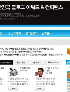 대한민국 블로그 TOP 100 선정 2012한 해 동안 가장 왕성하게 활동한 블로그를 뽑는 2013 대한민국 블로그 어워드 개인부문 수상자 선정 투표가 시작되었습니다. '대한민국 블로그어워드'는 2012년 한 해 동안 왕성하게 활동한 5개 부문 100대 블로그를 후보라 선정하여 온라인 투표와 전문가 심사를 진행합니다. 2013 대한민국 블로그 어워드는 사단법인 한국블로그산업협회(KBBA)가 주최하고, 문화체육관광부, 방송통신위원회, 한국인터넷진흥원, 서울시 그리고 한국교육학술정보원, 미디아유, 유저스토리랩, Fotolia, NHN, 다음커뮤티케이션, SK커뮤니케이션, 시니어파트너즈, 블로그칵테일, 티엔엠미디어, YES24 등 쟁쟁한 블로그 관련 기업들이 후원을 합니다. '2013 대한민국 블로그 어워드(..