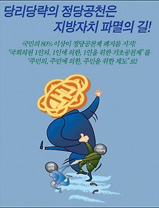728x90 반응형 정당공천제4 안상수 창원시장 출마설, 불쾌하다 6.4 지방선거를 앞두고 온갖 예상과 추측이 난무하고 있습니다. 특히 통합 창원시장 재선 도전과 경남도지사 출마를 놓고 저울질을 하던 박완수 창원시장이 도지사 출마를 선언하면서 창원시장 후보에 대한 온갖 추측이 난무하고 있습니다. 아직 기초단체장 후보에 대한 정당공천제 폐지 문제가 매듭지워지지 않은 상황에서 특히 여권 후보자들에 대한 지역 언론의 여러가지 추측성 보도가 이어지고 있습니다. 그 중에서 가장 불쾌한 보도는 바로 '안상수의 창원시장 출마설'입니다. 한나라당 원내대표와 당대표(2010~2011)를 지내고 4선(15, 16, 17, 18대) 국회의원 경력을 가진 안상수가 보궐선거에서 당선된 홍준표 현 경남도지사에 이어 경남도지사 출마를 저울질 하는 것부터 기분 나쁜 일이었습니다. 그런데 홍준표 현.. 2014. 2. 4. 정당공천제 폐지 공천비리 때문만 아니다 새누리당이 대통령 선거 때 약속한 정당공천제 폐지 약속을 내팽게치는 모양입니다. 대통령 선거를 앞두고 치뤄진 보권선거에서는 정당공천제가 있는데고 불구하고 공천을 안 하는 '쇼'까지 벌이더니 대통령에 당선되고 나서는 완전히 안면을 바꾸고 있습니다. 사실 정당공천제 뿐만아니라 온갖 공약을 파기하고 있으니 새삼스러운 일도 아니기는 합니다. 그런데 정당공천제 폐지를 할 수 없다고 하는 새누리당의 핑게가 참 가관입니다. 오늘 아침 출근길 뉴스에 새누리당 국회의원(방송을 중간부터 들었기 때문에 이름은 확인 못했음)이라는 자가 나와서 정당공천제 공약을 지킬 수 없는 까닭을 이야기 하는데 참으로 기가막힌 핑게를 댔습니다. 그 자는 정당공천제 폐지 주장이 나오게 된 원인으로 두 가지 진단하였습니다. 첫째는 국회의원들이 .. 2014. 1. 24. 정당공천제 폐지 공약지켜라 ! 박근혜와 새누리당이 정당공천제 폐지 약속을 지키지 않으려는 시도를 하고 있습니다. 대통령에 당선되기 전에는 '정당공천제'를 폐지 할 것처럼 이야기 해놓고 대통령에 당선되고 나더니 "나몰라"라 하는 식입니다. 정당공천제 폐지에 반대하는 세력은 두 축입니다. 정당공천제와 비민주적인 하향식 정당 공천을 통해 기득권을 행사하고 있는 새누리당과 보수야당의 국회의원들 그리고 당내 민주주의와 책임 정당제를 주장하는 진보정당과 시민사회 세력으로 나뉘어집니다. 기득권을 내놓지 않으려는 새누리당과 보수야당의 주장은 일고의 가치도 없다고 보지만, 진보정당과 시민사회 일부의 주장은 틀린 주장은 아니기 때문에 일축할 수 있는 문제가 아닙니다. 사실 정당공천제를 폐지하자고 하는 쪽에서도 앞으로 영원히 정당공천제를 폐지하자는 주장.. 2014. 1. 22. 마산 제2청사는 내년 선거용? 통합 창원시 제 2청사 마산 이전 문제가 조금씩 수면 위로 올라오고 있습니다. 몇주 전 박완수 창원 시장이 모 언론사 인터뷰에서 제 2부시장 산하에 있는 부서를 옛 마산시 청사로 이전하고, 제 2청사를 설치하는 방안을 검토하고 있다는 언급을 하였습니다. 또 지난 10일 연린 제 33회 창원시의회 2차 정례회에서도 박완수 시장이 같은 언급을 하였다고 합니다. 시정 질문에 답하는 형식이었지만 "시청사 분리 배치, 청사 사무공간 재배치"를 추진하겠다는 의지를 보였다고 합니다. 정치인들이 사용하는 언어로 "아직 검토 중인 대안의 하나"라고 전제하였다지만, 이것은 여론의 추이을 지켜보겠다는 의미일뿐 사실상 시청사 위치 문제를 수습하는 가장 유력한 대안으로 검토하고 있다는 뜻이라고 봐야 합니다.왜냐하면 내년 도지사.. 2013. 12. 12. 이전 1 다음 728x90 반응형